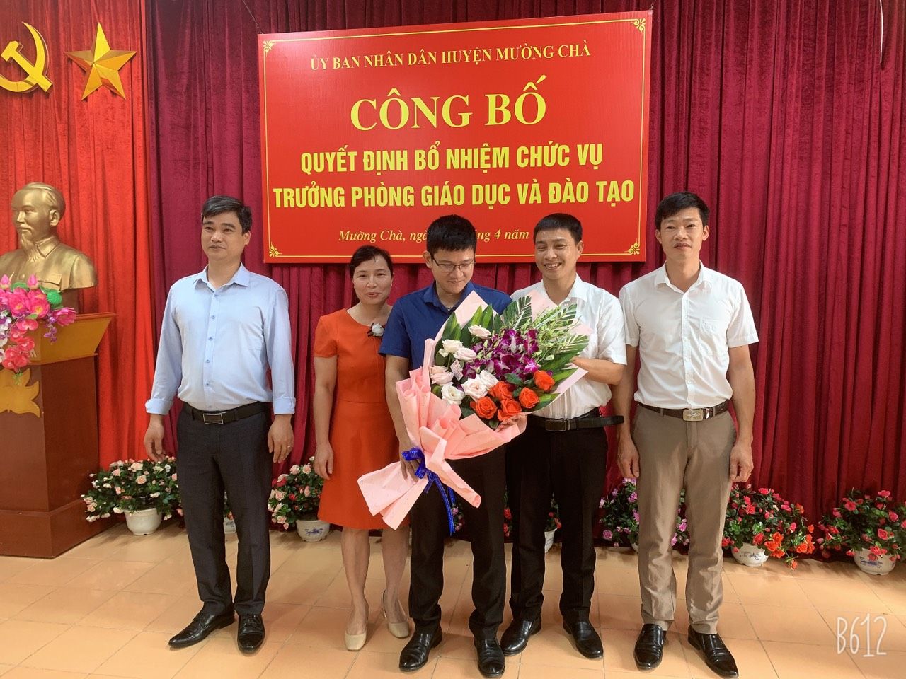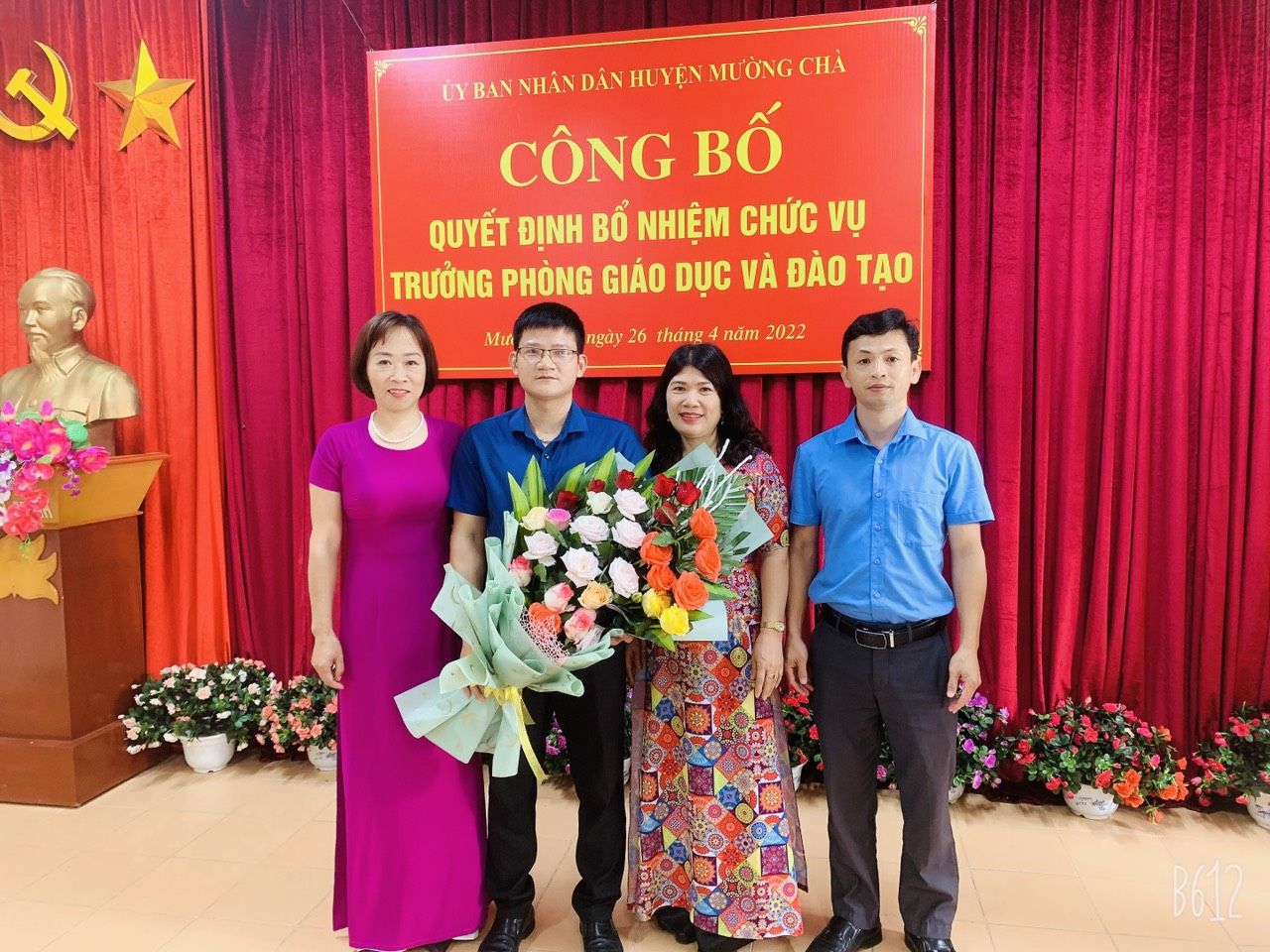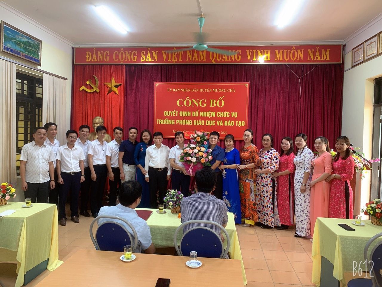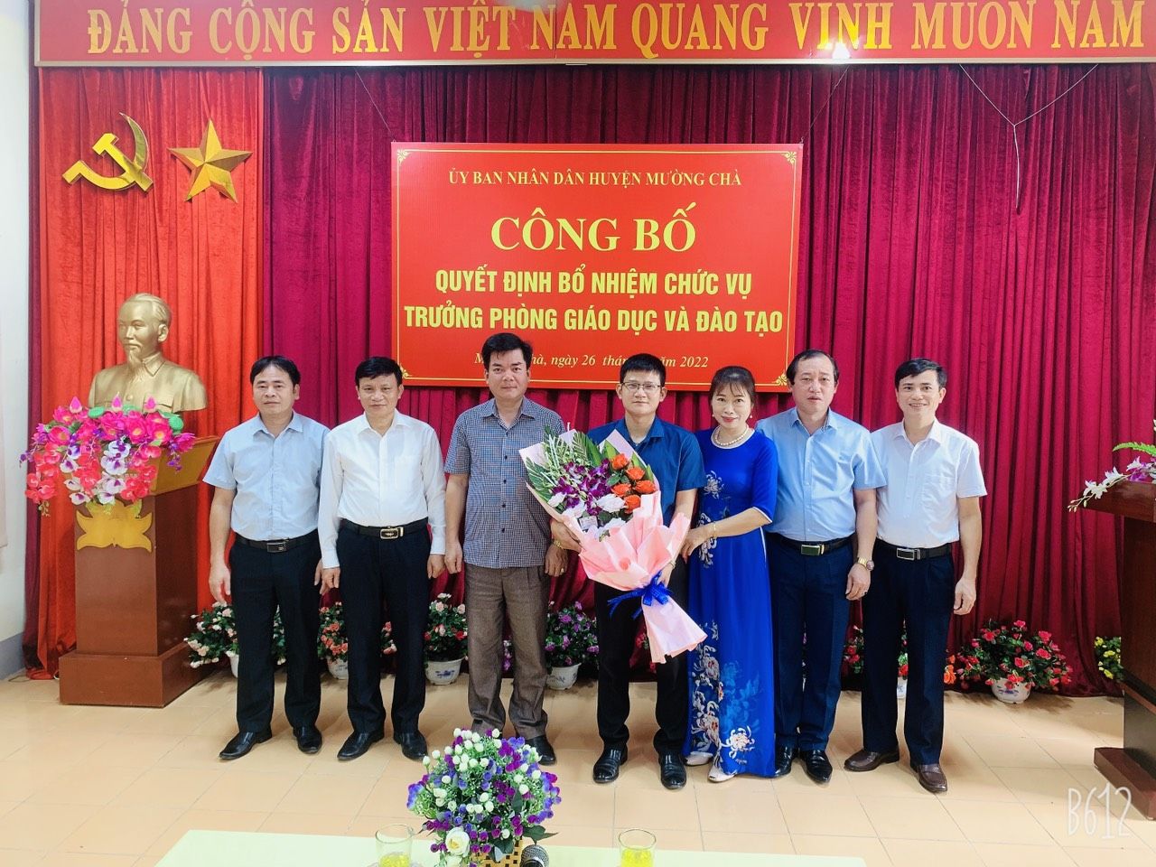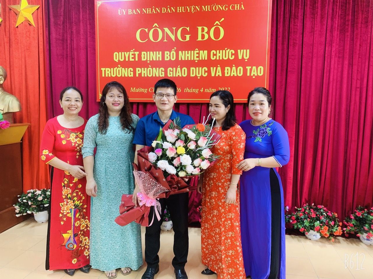 Tập thể văn phòng Phòng GDĐT tặng hoa chúc mừng, chụp ảnh lưu niệm cùng đ/c tân Trưởng phòng GDĐT