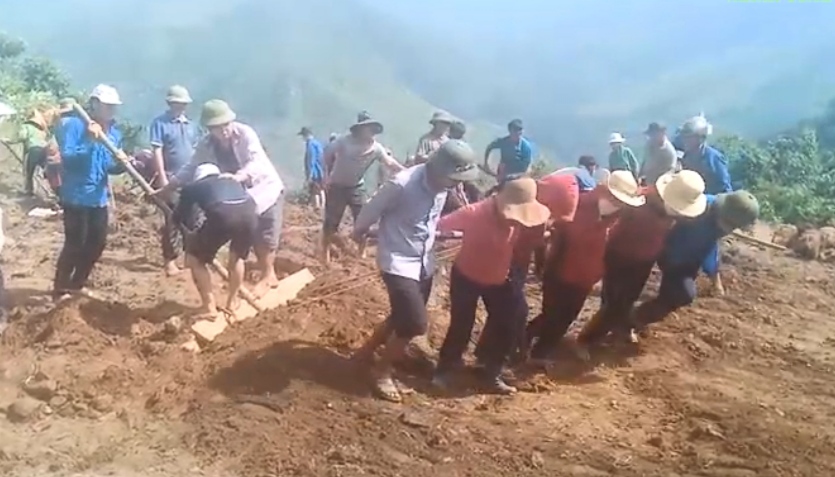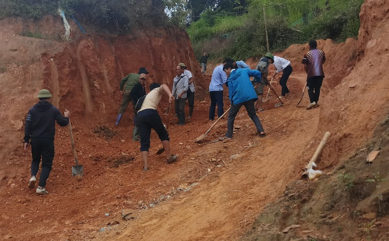 Giáo viên cùng nhân dân sửa đường để vận chuyển vật liệu