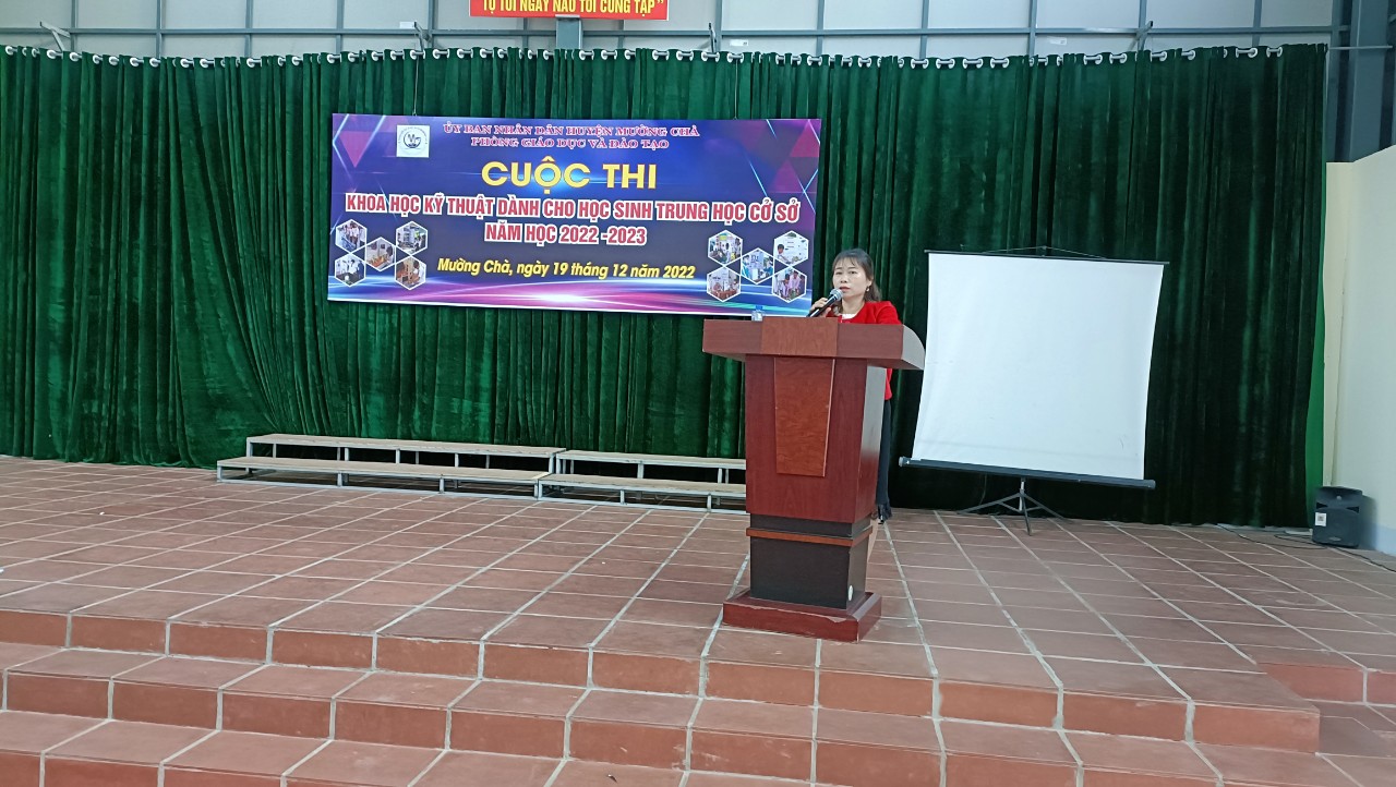 (Cô Nguyễn Thị Thuý – Phó trưởng phòng GDĐT đọc báo cáo tổng kết cuộc thi)