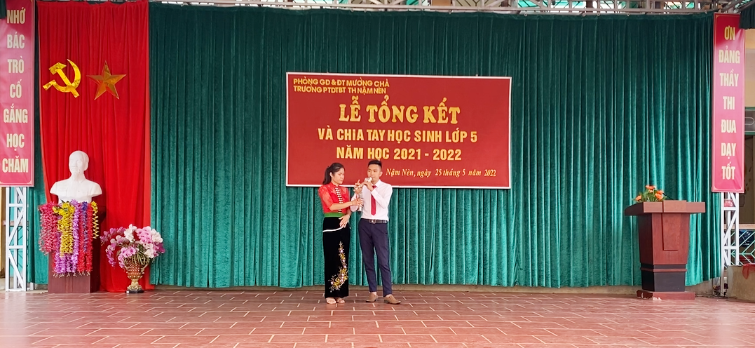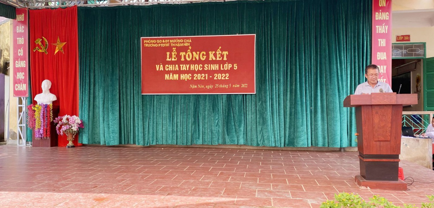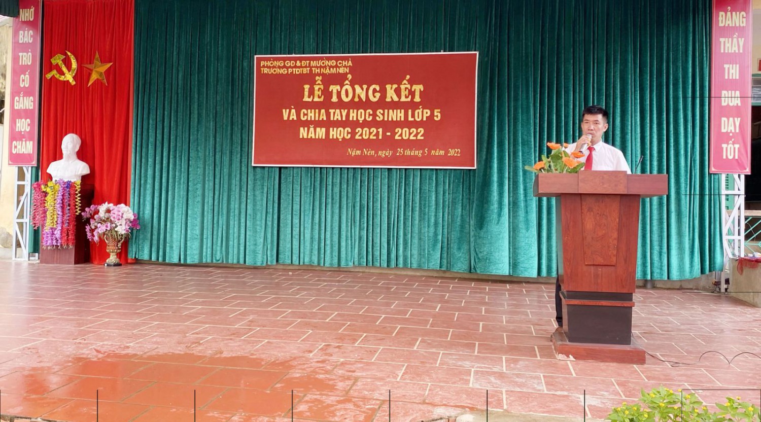 Tiếp theo là bài phát biểu tổng kết năm học của thầy Hiệu trưởng. Để đánh giá lại những kết quả đã đạt được trong năm học vừa qua, cũng như để kịp thời động viên, khen thưởng những thầy cô giáo đã có thành tích xuất sắc trong năm học vừa rồi, cô giáo Trần Thị Hằng PHT nhà trường, phó CTCĐ lên thông qua các quyết định thi đua khen thưởng CBGVNV và học sinh nhà trường năm học 2021-2022. Tại buổi lễ tổng kết hôm nay, các em học sinh cuối cấp đã có buổi lễ tri ân sau nhiều năm học tập dưới mái trường. Để tiếp tục động viên tinh thần thi đua dạy tốt – học tốt trong những năm tiếp theo của thầy và trò nhà trường, Ông: Lò Văn Thợi - PCT UBND xã Nậm Nèn nên phát biểu chỉ đạo, động viên khích lệ thầy và trò nhà trường. Trong năm học vừa qua, nhờ sự quan tâm chỉ đạo kịp thời của lãnh đạo các cấp các ngành, bậc CMHS, sự điều hành của BGH, sự nhiệt tình, tâm huyết, tích cực đổi mới phương pháp dạy học, tất cả vì học sinh thân yêu, phát huy đạo đức nhà giáo của các thầy cô giáo; đặc biệt là sự vươn lên trong học tập, tích cực tham gia các phong trào thi đua, rèn luyện đạo đức tác phong, vượt qua khó khăn của các em học sinh nên trường PTDTBT tiểu học Nậm Nèn đã thực hiện tốt nhiệm vụ năm học 2021- 2022.