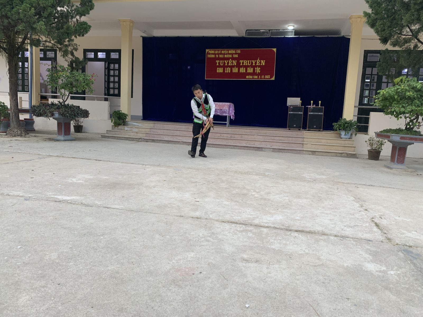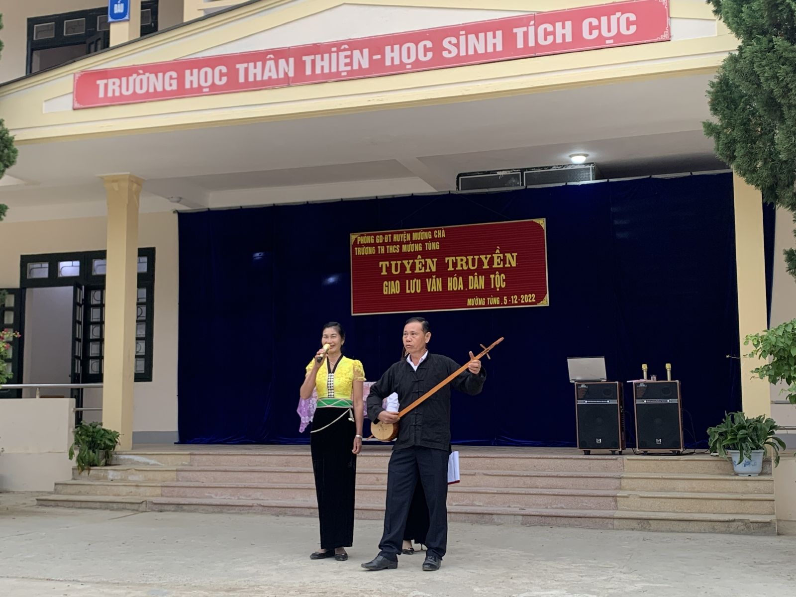 Cũng tại buổi giao lưu các em học sinh của trường được các cô, các bác trong đội văn nghệ của xã Mường Tùng giới thiệu và biểu diễn nhạc cụ của dân tộc thái như đàn Tính Tẩu, muá Nón, tung Còn,...
