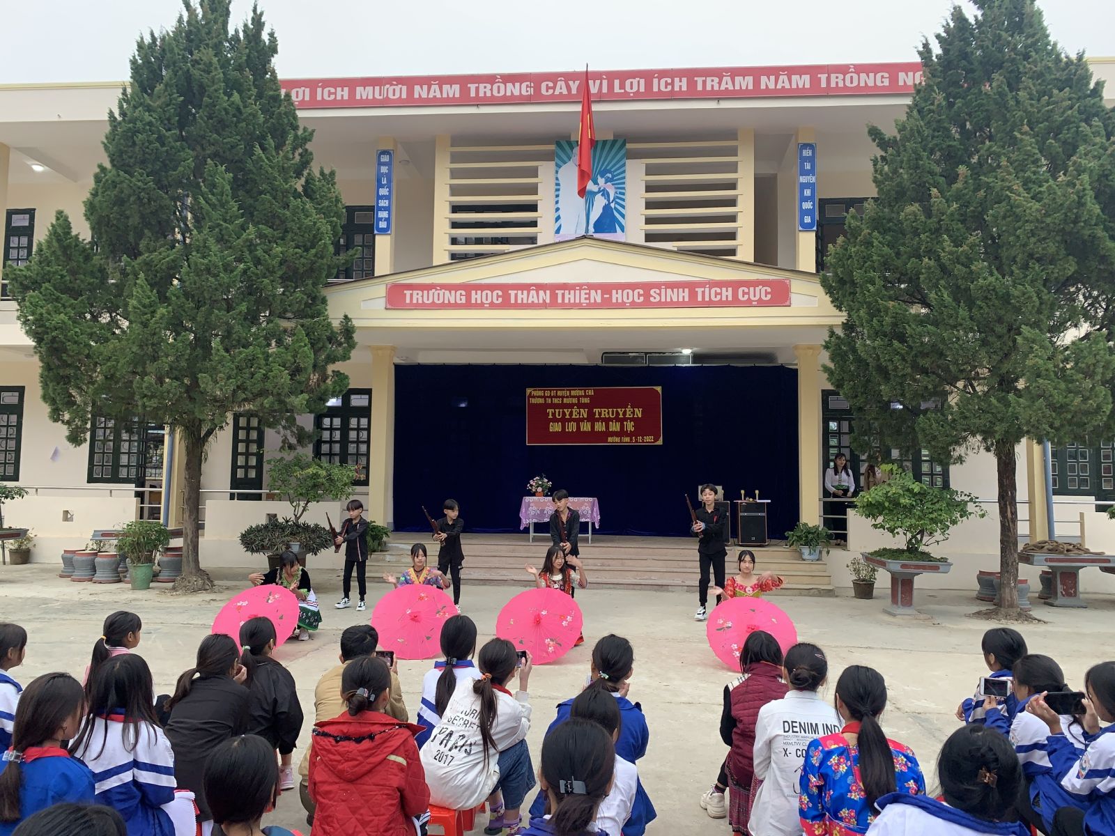 Các em học sinh của trường tham gia biểu diễn văn nghệ tại buổi giao lưu