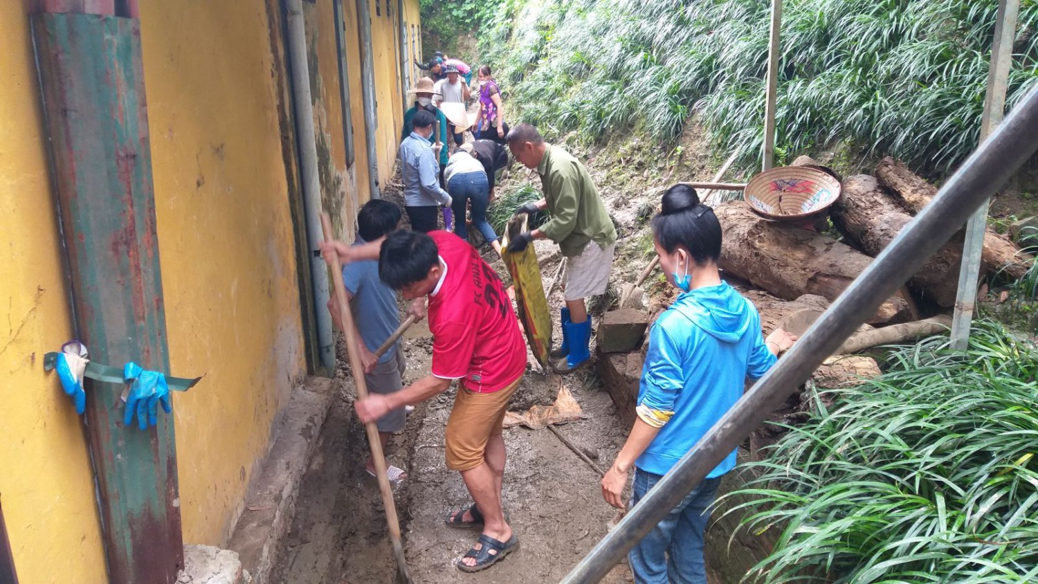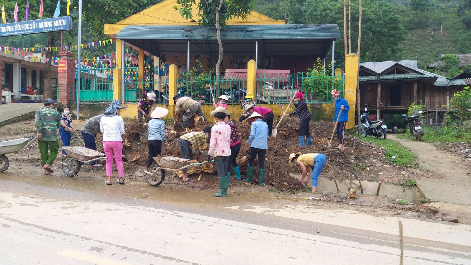 Đồng hành với thầy cô giáo và các em học sinh tham gia hưởng ứng tuần lễ Quốc gia nước sạch và vệ sinh môi trường năm 2022 là các bậc phụ huynh. Từ các bản vùng cao khó khăn cho đến những bản vùng thấp thuận lợi, các bậc phụ huynh cũng tích cực tham gia khơi thông cống rãnh, thu gom rác, quét dọn, làm sạch hành lang đường giao thông ở khu vực cổng trường.